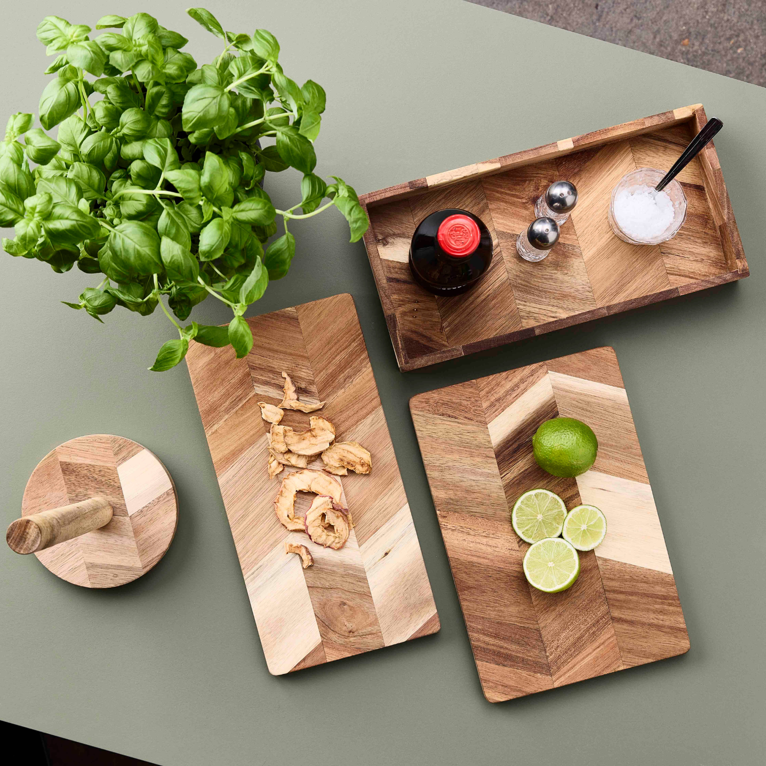 In our collection, Acacia plays an important role as a natural and durable material for kitchen and serving use. Acacia is known for its natural strength and beautiful herringbone patterns, giving each product its own unique character. When cared for properly, it offers a long lifespan. We recommend washing the products by hand, drying them thoroughly and allowing them to air dry completely. To prevent the wood from drying out, it is recommended to treat it regularly with a food-safe oil, which helps maintain its natural glow. Should any odours occur, the products can be refreshed using a mixture of coarse salt and lemon. All of our acacia wood products are made from FSC-certified wood and come from responsibly managed, FSC®-certified forests.