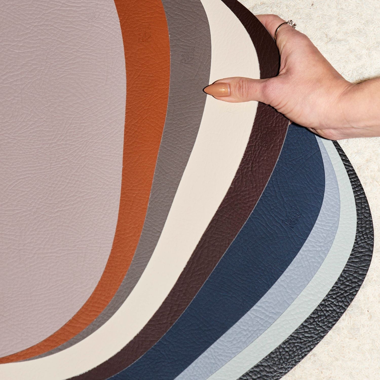 Our leather placemats are made from 95% recycled leather and 5% adhesive. Leather from an animal has an organic form, which means that when leather is used for bags, jackets and the like, there will be pieces of leather left over from the cuts. These pieces are still 100% leather, but they are too small to be used for larger products such as furniture and clothing. Instead, these small pieces can be broken down into even smaller pieces. To achieve a cohesive piece, the small pieces of leather are mixed with an adhesive. The leather and adhesive are then shaped into one piece of the right size. This process results in placemats that are made from 5% adhesive and 95% leather that would otherwise have been discarded.