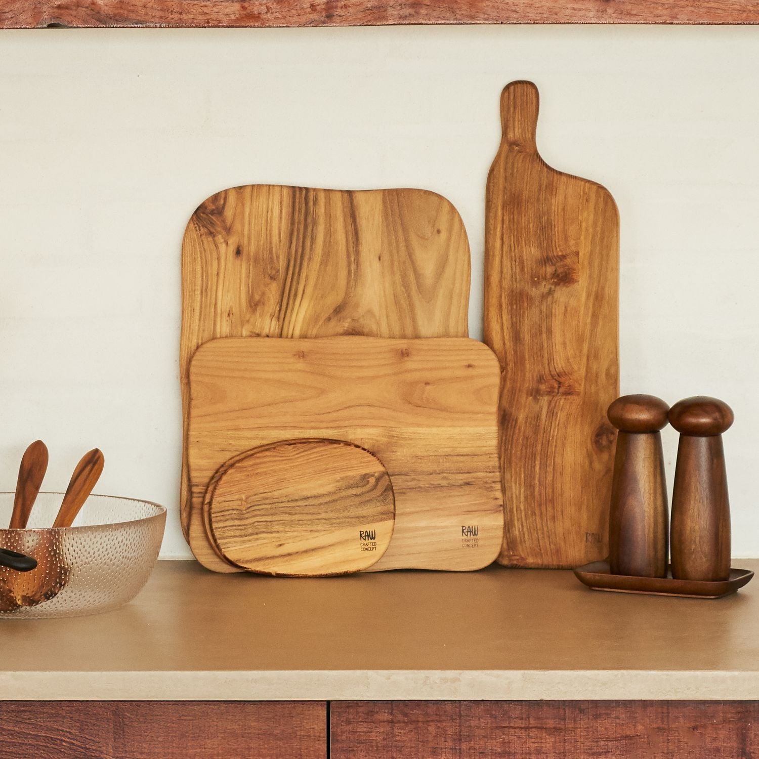 In our RAW universe, teak plays a big role, as teak wood is an extremely robust material that is almost impossible to wear out if it is treated correctly. Teak has a dense fiber structure, which makes it resistant to both heat and cold and ideal for use in the kitchen. Over time, teak can lose its shine, but with food-approved oil (for example, cooking oil) it can regain its shine. At the same time, it is possible to "clean" teak products with lemon and salt if odors should arise. All of our teak products are made from FSC-certified wood and come from responsibly managed, FSC®-certified forests.